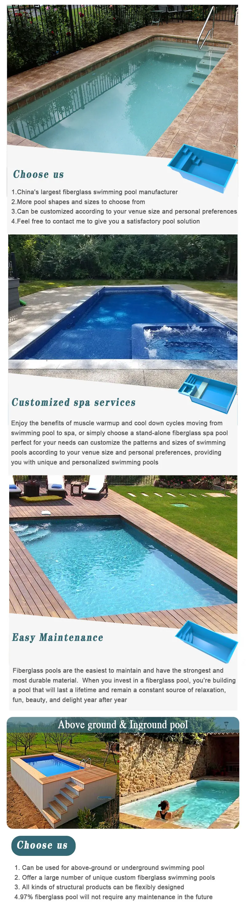 Fiberglass pools don’t need to be acid washed, won’t develop any wrinkles you’ll need to smooth out, and they’re also free frommany of the other common maintenance chores you might need to tackle with other inground pool types.